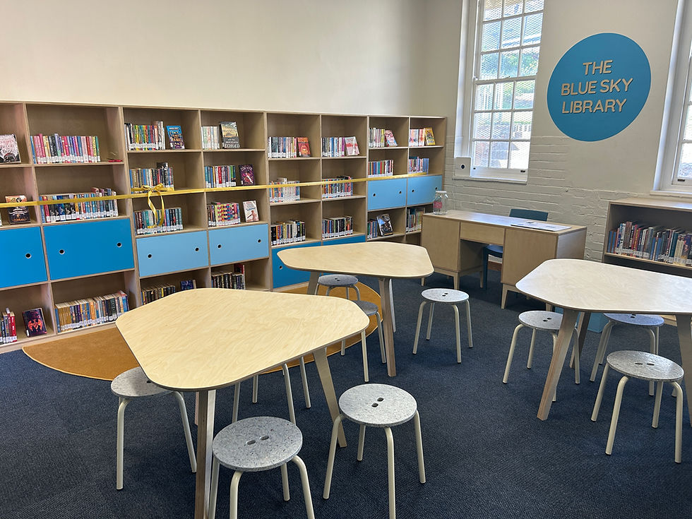 The Blue Sky Library is the High School Library at Seven Steps Academy for the Deaf. This school host smaller classes for deaf learners using assistive devices. The space serves as a library and study space - offering opportunities for small group work and research along with the collection of books.